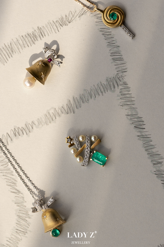 LadyZ Jewellery珠宝藉由独特的设计美学和彰显品牌引以为傲的两大核心元素——温润珍珠与神秘祖母绿以及手工工艺,留英珠宝设计师邹晨主导设计,塑造圣诞树、花环、铃铛、棒棒糖等节日布景,形成一组充满童趣的珠宝作品。